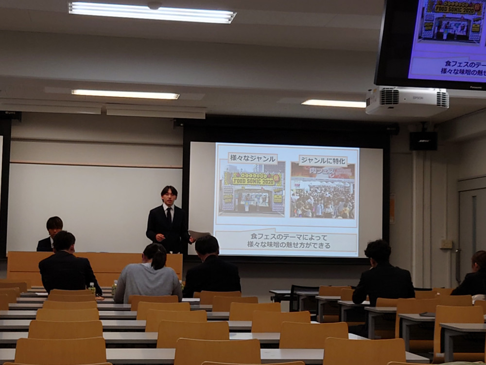 10月2日(月)4限、星が丘キャンパスにて、ナカモ株式会社様との産学連携中間報告会を開催。各チームが、「若者に味噌を普及させるためのプラン」について、現時点での検討内容を発表、その後チームごとにナカモ株式会社様とのフィードバックミーティングを実施した。