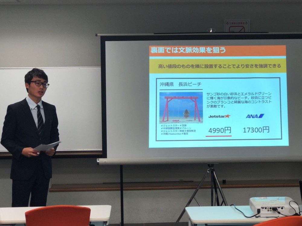 僕らのグループは中間報告1回目から案は変わらず、その案をどんどん肉付けしていくということを最後までしていました。しかし、どんどん肉付けしたことにより、本来の目的である「若者にウケる企画」というものから遠ざかってしまった企画になってしまいました。そのことを先生が教えてくれ、私達は「自分たちがおもしろいと思うもの」というものを追求しました。その結果、企業の方に好評をもらえる企画にすることができました。このことから、消費者側の立場にたって客観的に物事を見るということがとても重要なことだということを学びました。<コメント:民田>