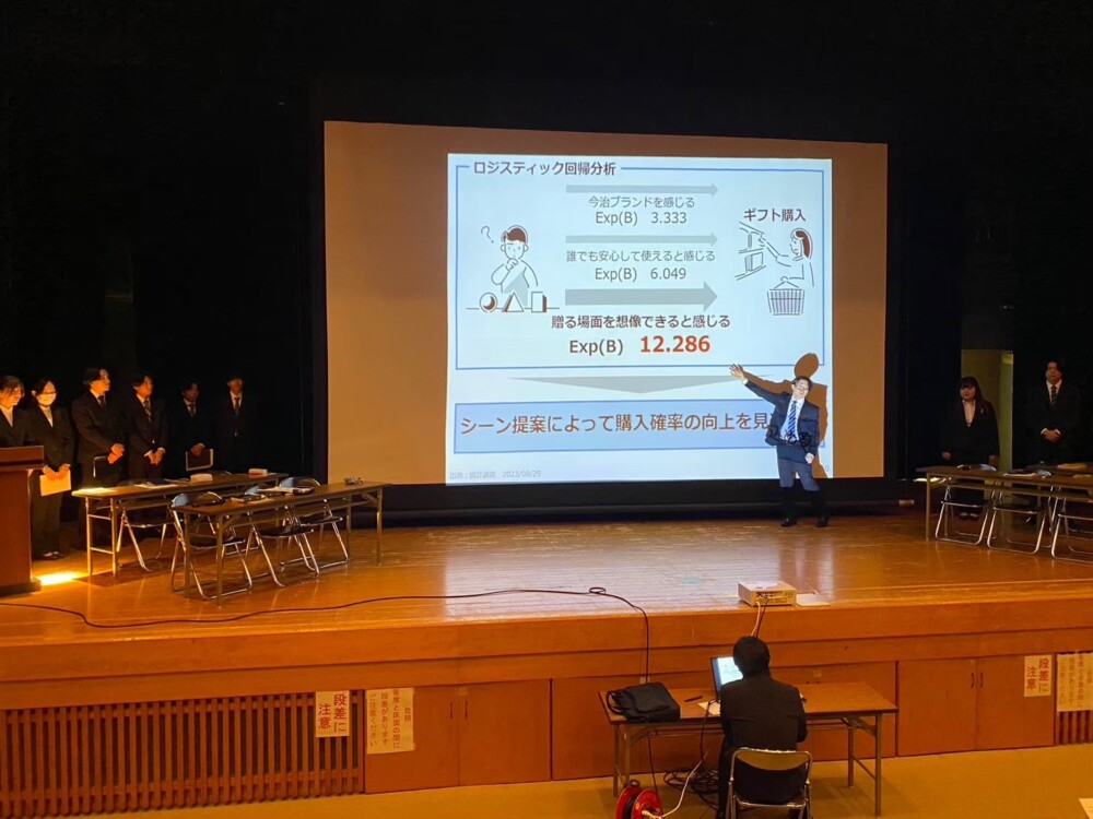 産学連携報告では家族、OB・OGの方に私たちがどのような産学連携を行っているのか今までの活動をまとめて報告させていただきました。2年生はナカモ株式会社様との産学連携について、3年生は本多タオル株式会社様との産学連携・プレゼンコンテストについて報告させていただきました。